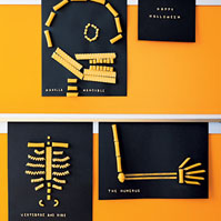 I love this idea. Use various kinds of raw pasta and black paper to make pasta skeletons like these for Halloween. Make all the separate panels and piece it together on the wall for your completed skeleton. Follow the link below for more.